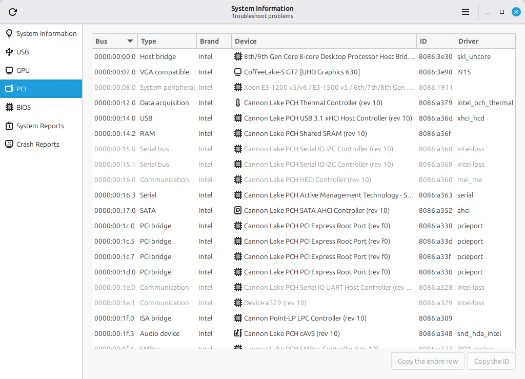 The “PCI” page gives you a detailed look at the internal components of the computer. The PCI ID and the driver in use are very useful when troubleshooting PCI devices.
